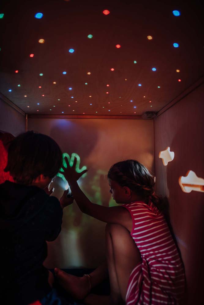 Abends, wenn es ruhiger wird, verwandelt sich KuWiH in eine kleine Traumwelt: Der gebohrte Sternenhimmel in der Deckenplatte lädt zum Kuscheln und Träumen ein, und mit Leuchtstiften oder einer Taschenlampe kann die fluoreszierende Seite der Höhle im Dunkeln zum Leben erweckt werden.